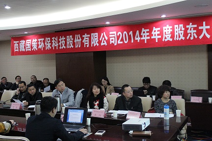 西藏國策環(huán)??萍脊煞萦邢薰?014年度年度股東大會(huì)在成都召開,董事會(huì)秘書楊偉強(qiáng)主持會(huì)議。董事長兼總經(jīng)理陳鴻、副董事長范津濤、副總經(jīng)理幸川、財(cái)務(wù)總監(jiān)趙永花、證券部經(jīng)理張麗等公司董事及核心成員出席本次會(huì)議。
