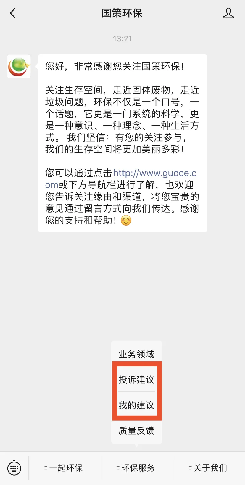 同時(shí),社會(huì)公眾可通過關(guān)注國策環(huán)保微信公眾號(hào),對(duì)國策環(huán)保運(yùn)營項(xiàng)目的環(huán)衛(wèi)質(zhì)量和服務(wù)水平提出意見和建議,對(duì)保潔不到位、清運(yùn)不及時(shí)的路段或點(diǎn)位拍照上傳,反饋到云平臺(tái),國策環(huán)保將根據(jù)處理進(jìn)度,推送處理結(jié)果,達(dá)到社會(huì)共治的創(chuàng)舉。