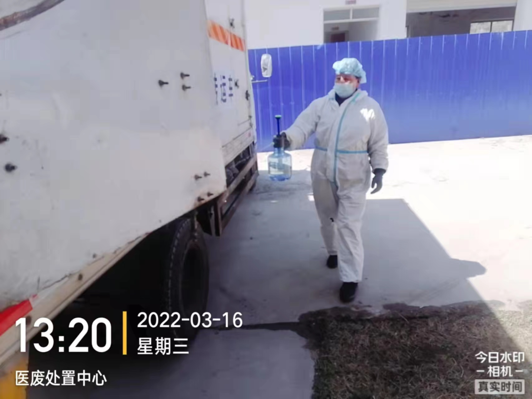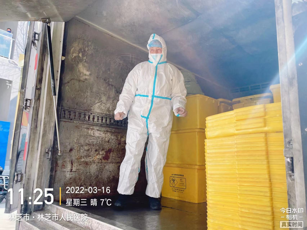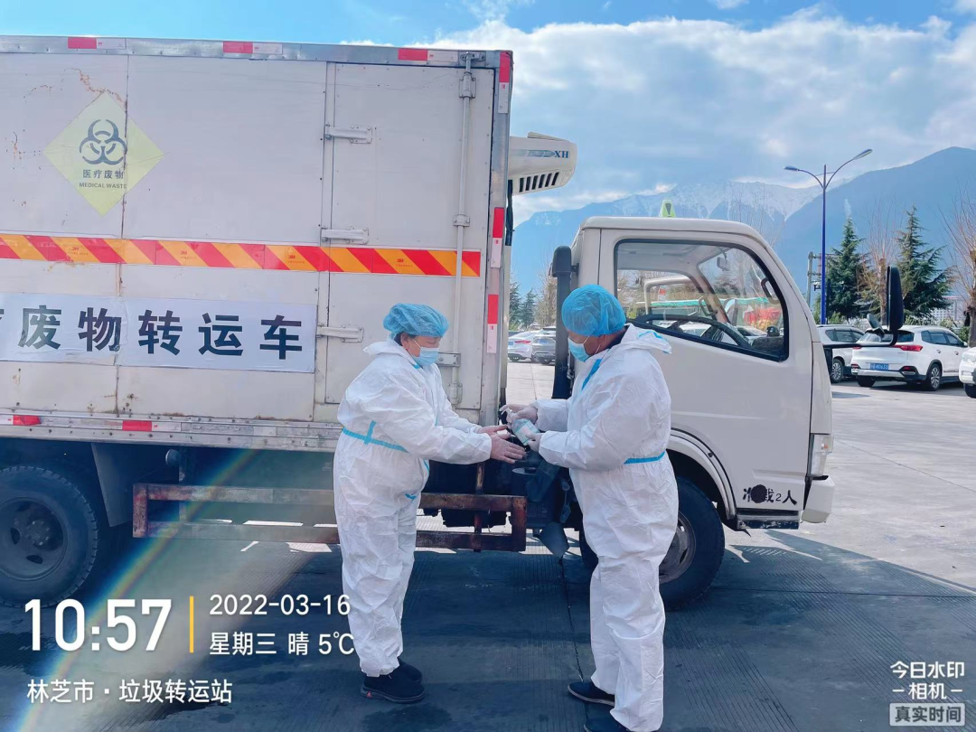 2、消殺完畢后,立即出發(fā)前往林芝市新冠定點(diǎn)醫(yī)院(林芝市人民醫(yī)院)收集轉(zhuǎn)運(yùn)新冠相關(guān)醫(yī)療廢物,與林芝市人民醫(yī)院醫(yī)廢暫存間工作人員確認(rèn)稱重并規(guī)范填寫危險(xiǎn)廢物轉(zhuǎn)運(yùn)聯(lián)單,收集完畢后對(duì)轉(zhuǎn)運(yùn)車內(nèi)外進(jìn)行消殺;